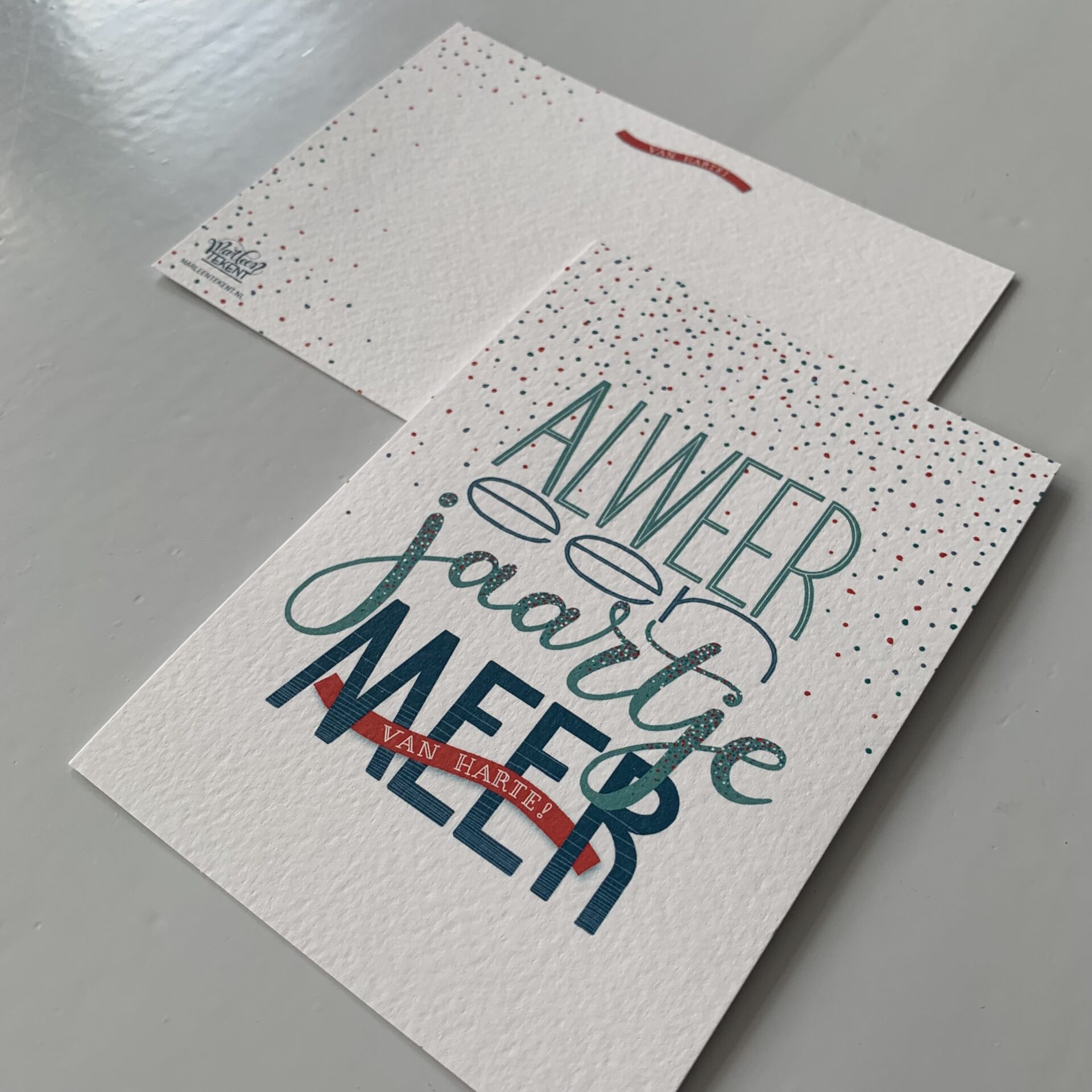 Formaat kaart A6, met unieke handettering gemaakt door MarleenTekent.