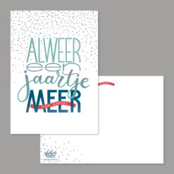 Kaartje Alweer een jaartje meer. Leuk om te versturen naar iemand die jarig is! Verstuur een kaartje en veroorzaak daarmee een glimlach bij de ontvanger.
